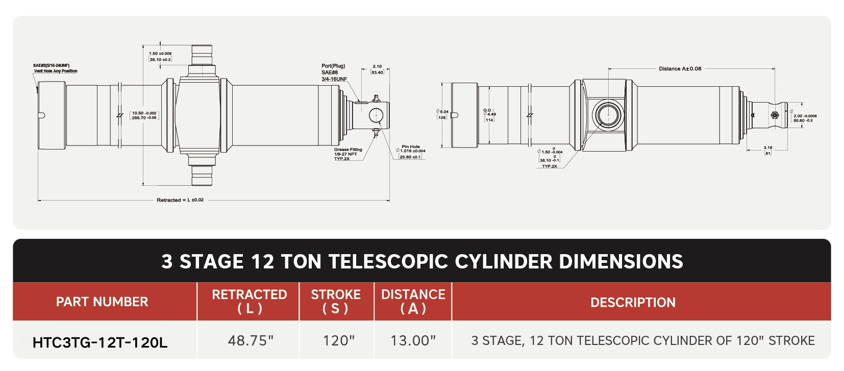 「HTC3TG-12T-120L」、3ステージ、12トンの120インチストローク13インチトラニオン距離伸縮シリンダ