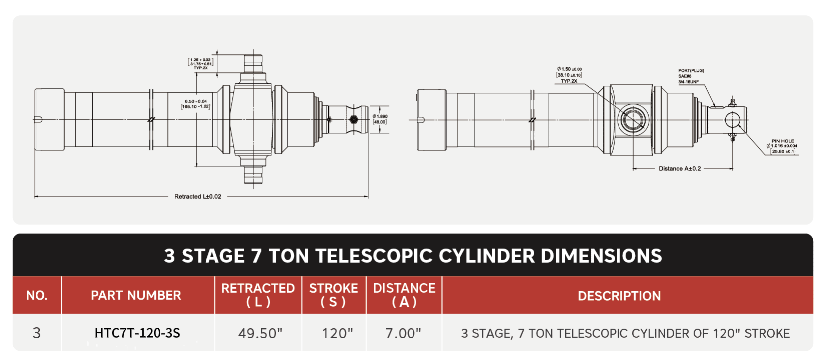 「HTC3TG-7T-120」 3段 7トン 120インチストローク伸縮シリンダ